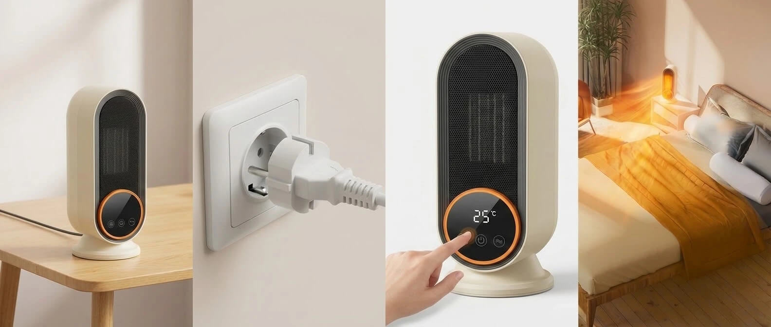 - Simply remove the heater from its packaging and place it on a stable, hard surface. Avoid placing it on soft or unstable surfaces like carpets or beds, as this could cause it to tip over.